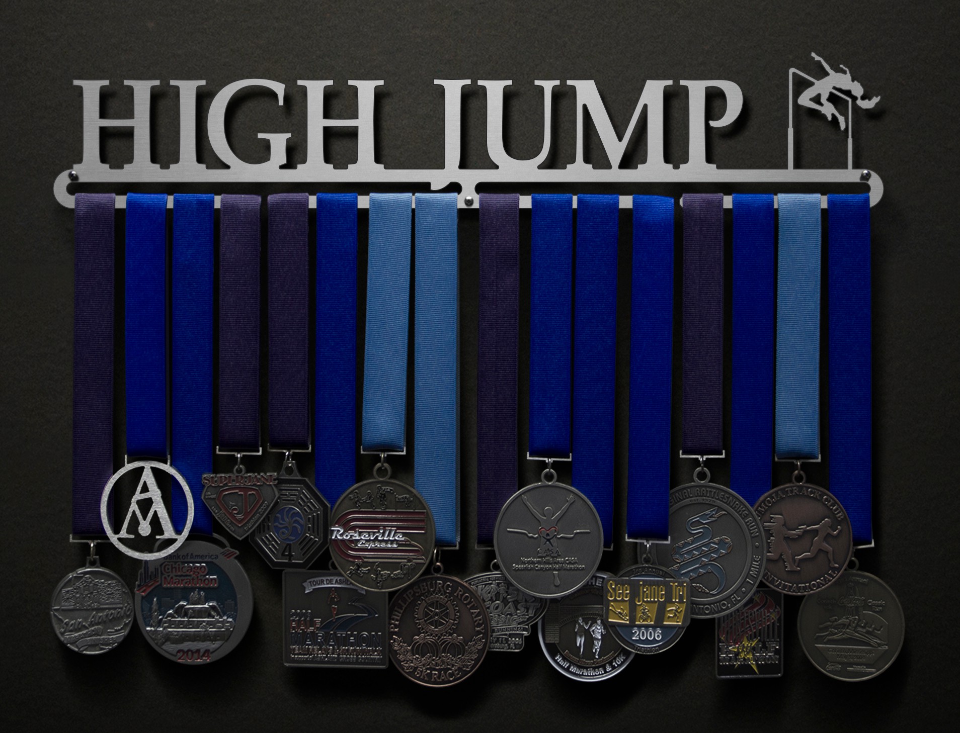 You worked so hard for the medal, just to throw it into a drawer?! Not anymore! Take yourself to new heights with this High Jump medal hanger! Every time you walk (or jump..) by this medal hanger you will be reminded of all your hard work and dedication that got you this far, which will keep you focused and give you the extra motivation you need to keep moving forward!