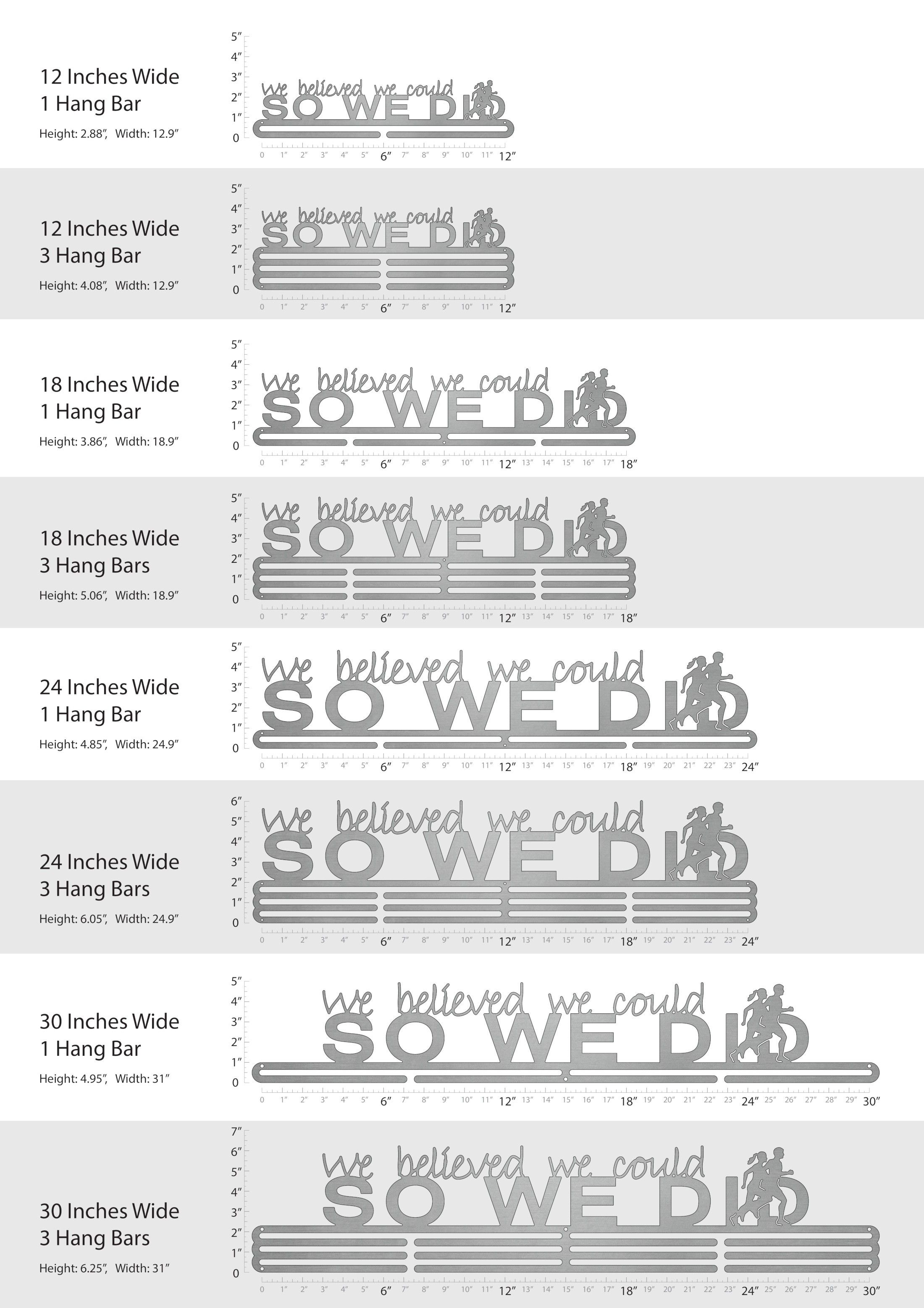 Unsure what size to get? We have created two consistently scaled images to show you what different sized displays look like when filled with medals.