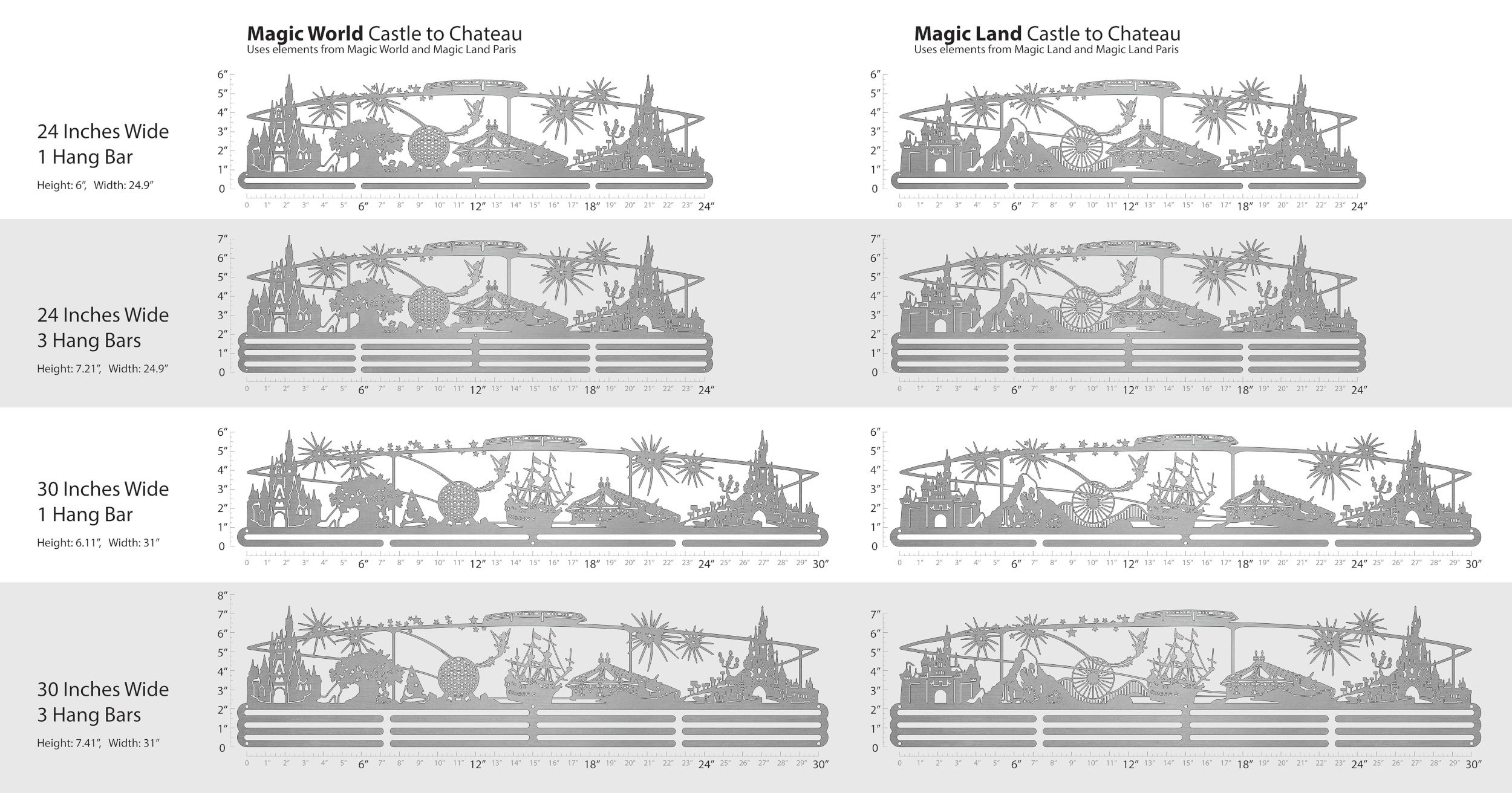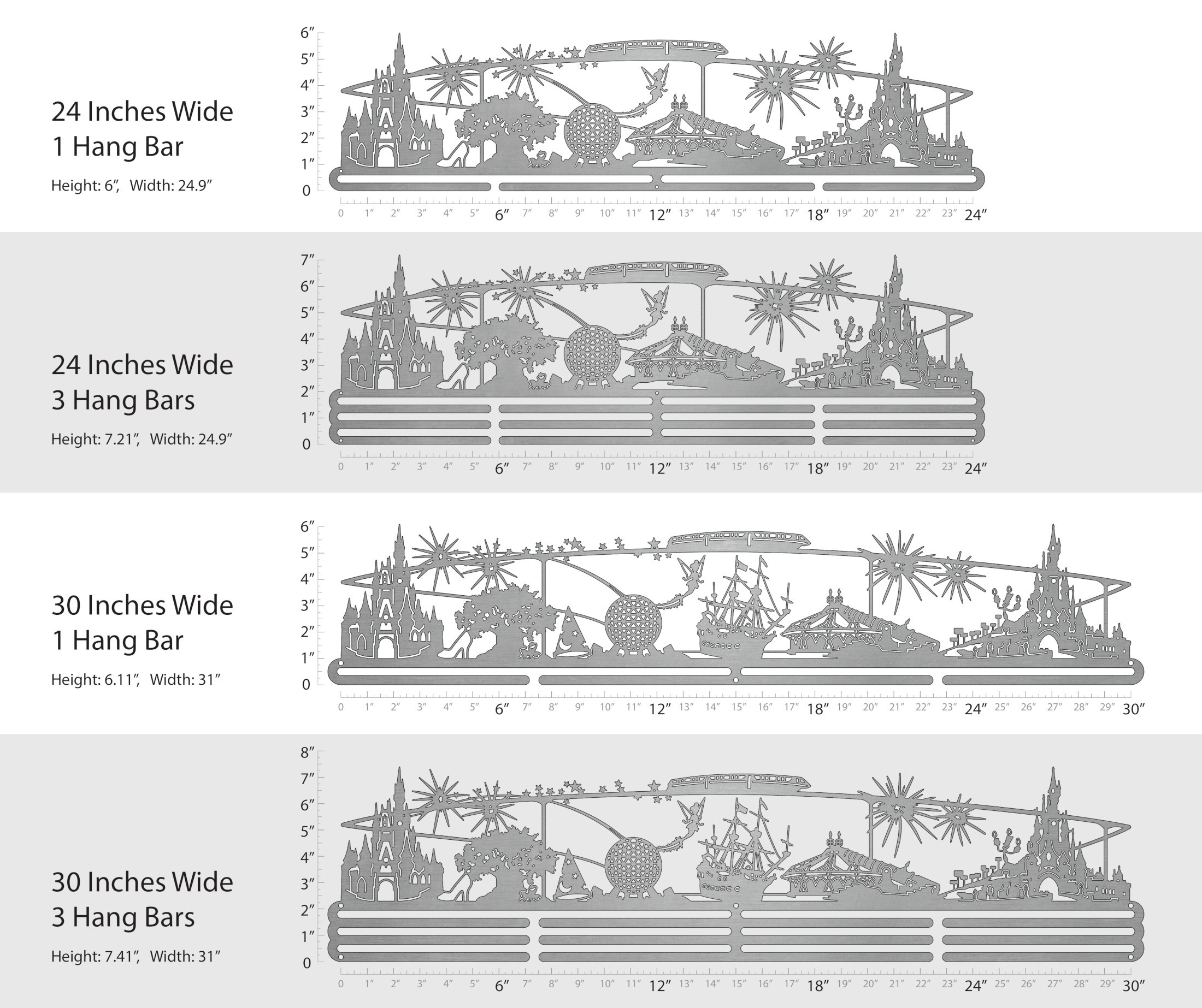 Unsure what size to get? We have created two consistently scaled images to show you what different sized displays look like when filled with medals.