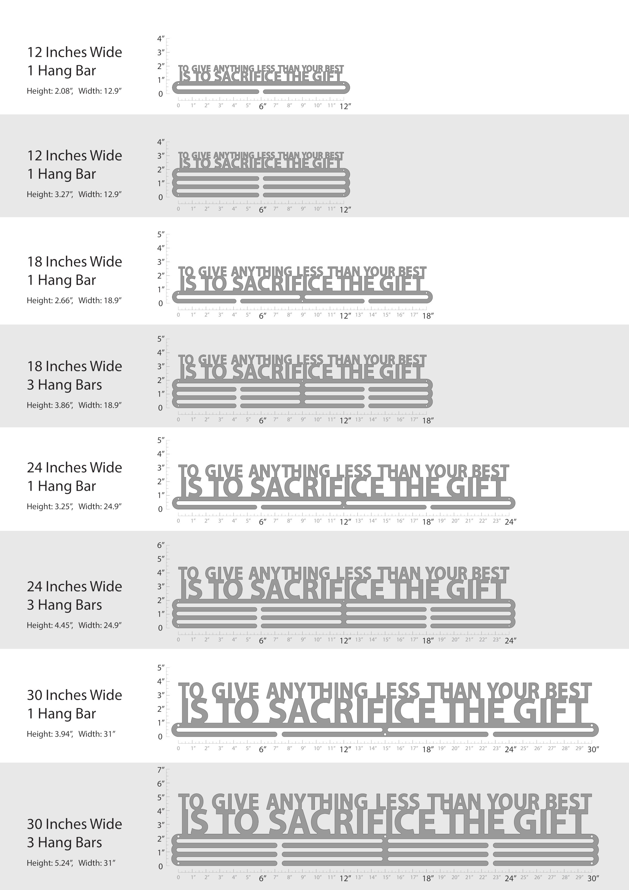 Unsure what size to get? We have created two consistently scaled images to show you what different sized displays look like when filled with medals.