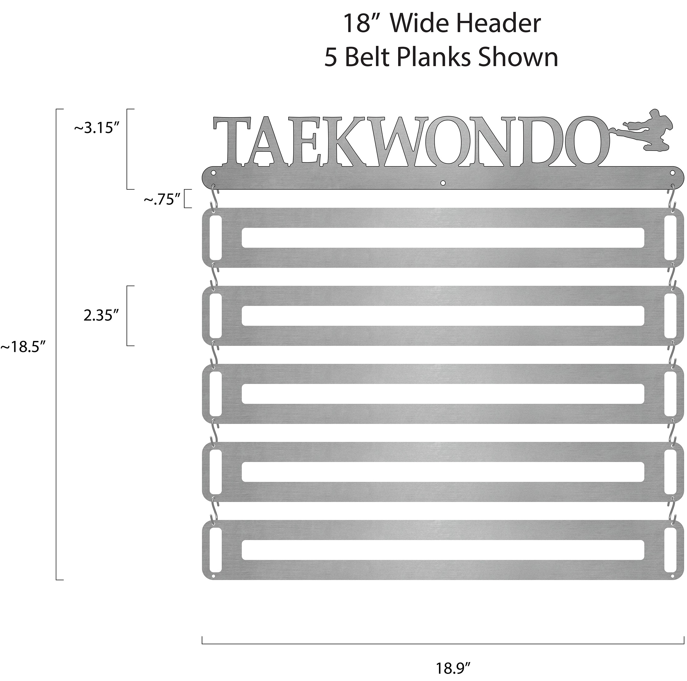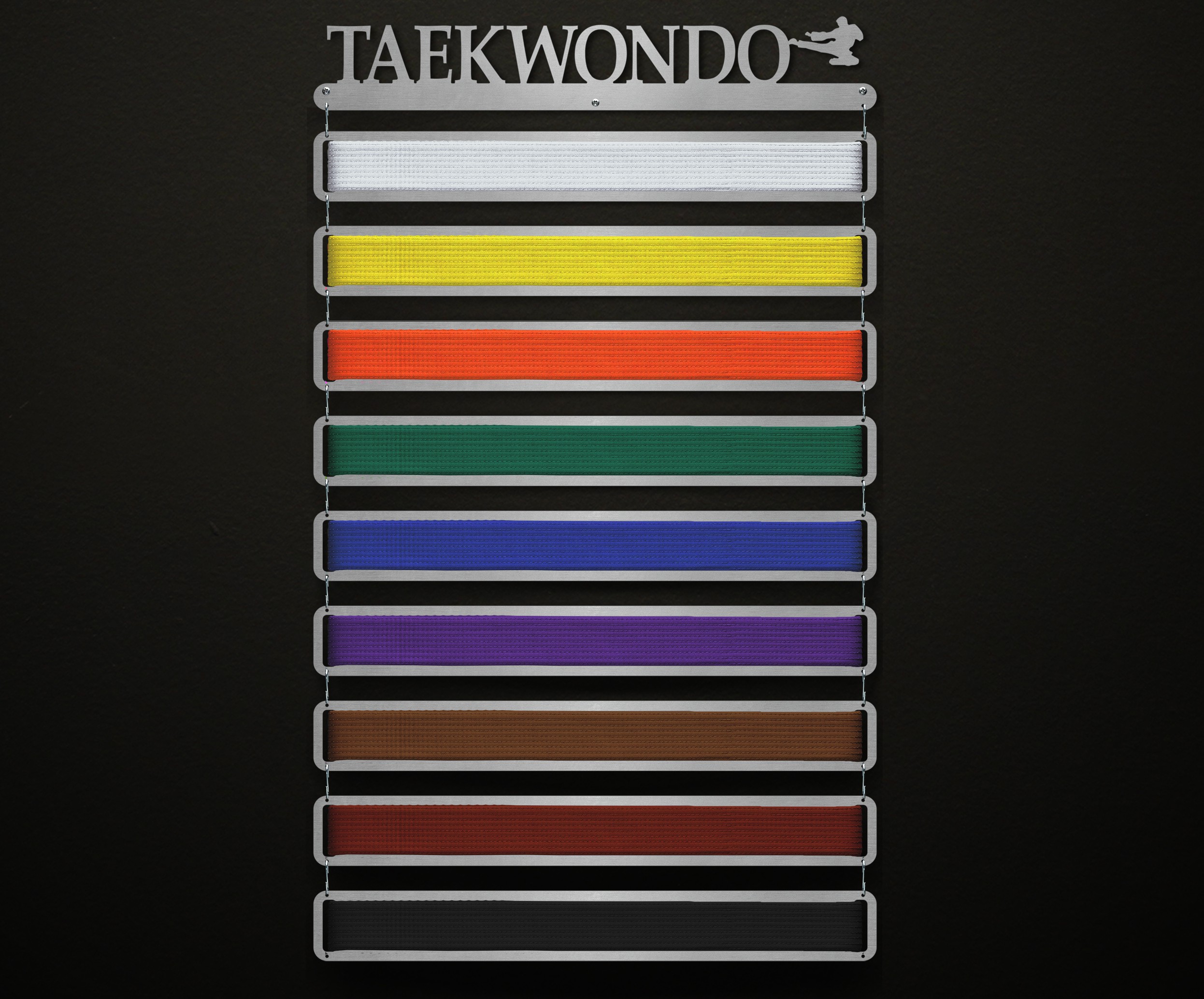 This modular design allows you to add your belts to the display as you earn them without having any blank or unused spaces for future belts. Once you earn a new belt, you just affix it to a new belt plank and hang it from your already-existing belt display!