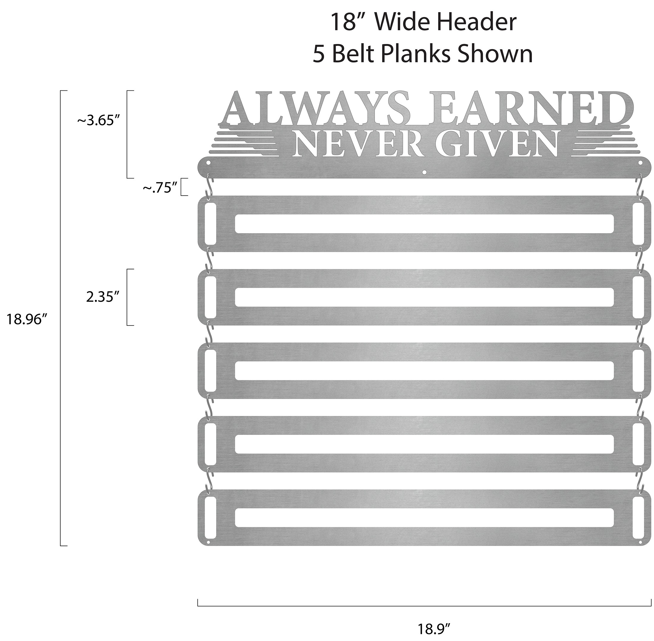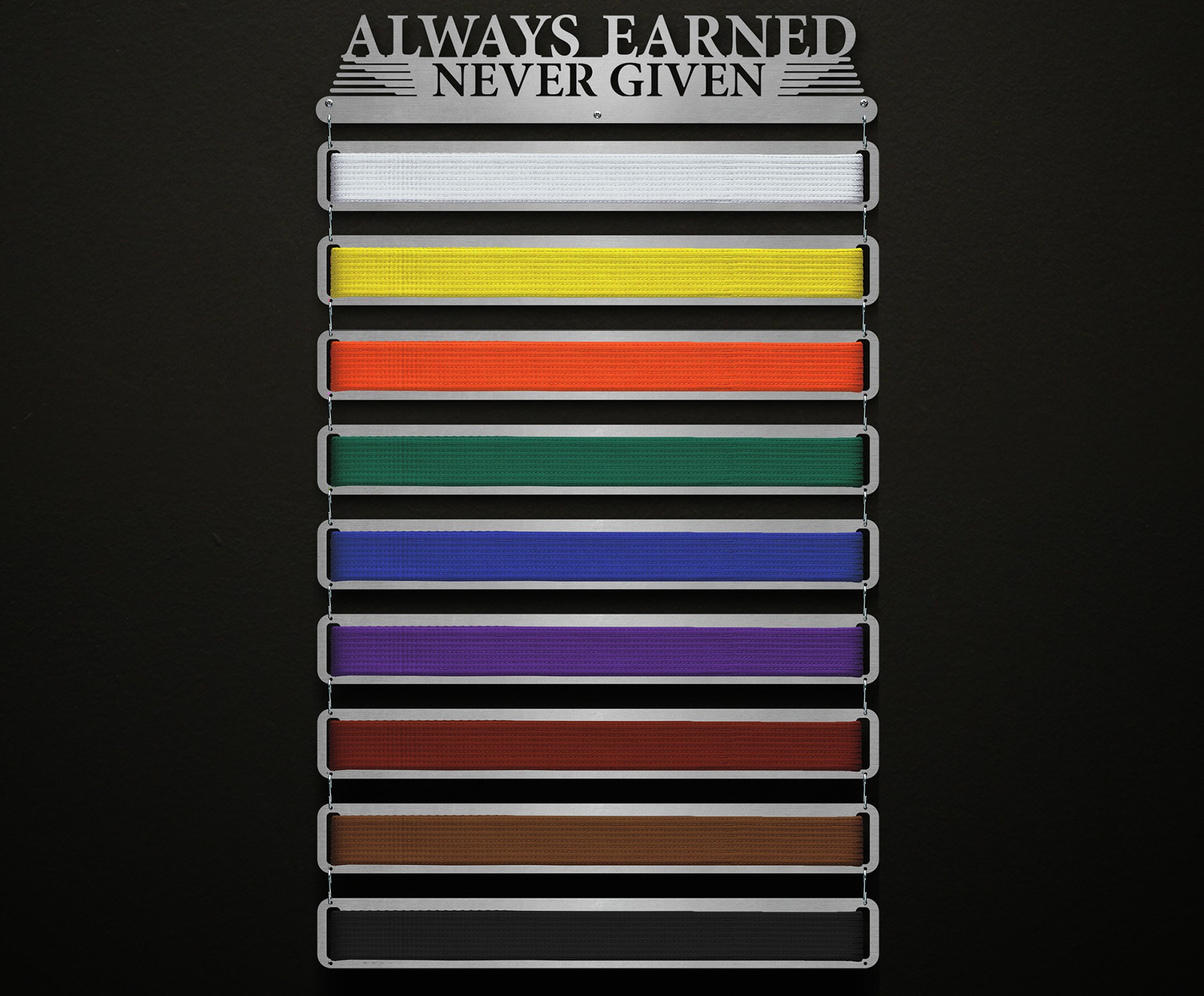 Anything you accomplish is accomplished by YOU. No one else can do it for you. Think of your belts as badges of courage, strength and determination. Then display them loud and proud with this laser cut stainless steel medal display. This hanger is only for earned belts, never given ones.
