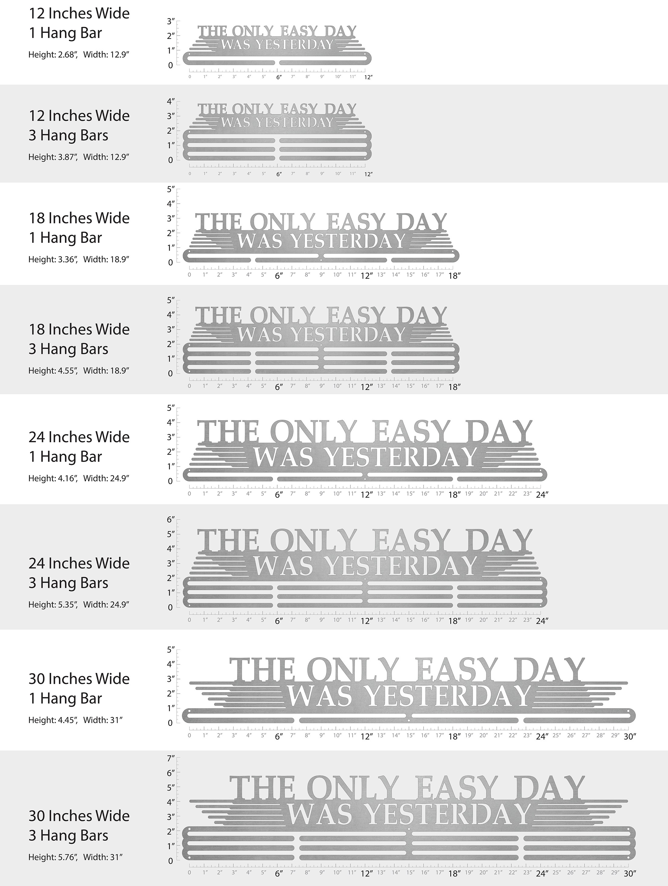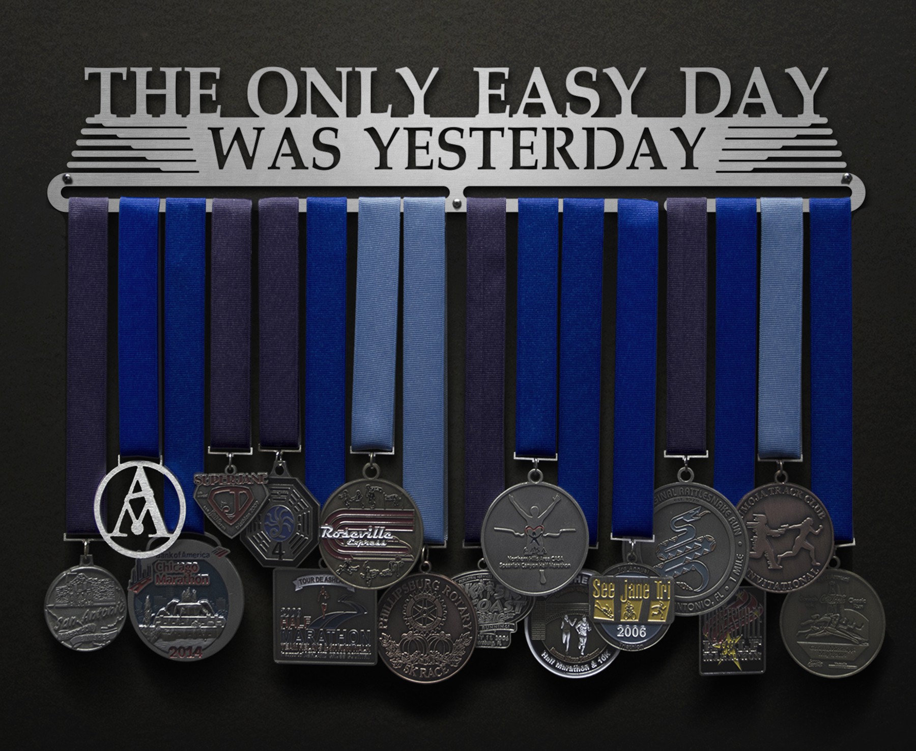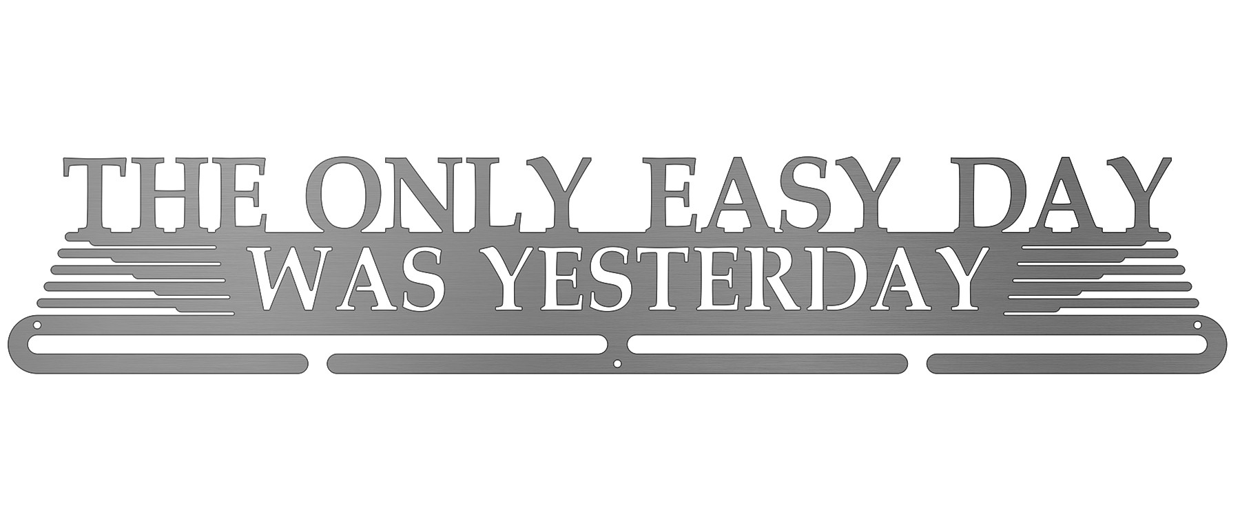 An inspirational quote used by the most elite fighting force in the U.S. Navy, the Navy Seals. Not only do you work harder each day than the day before; what you do today makes yesterday look easy. Showcase yesterday's victories with this medal hanger, and then make them look easy as you take on increasingly difficult challenges today.