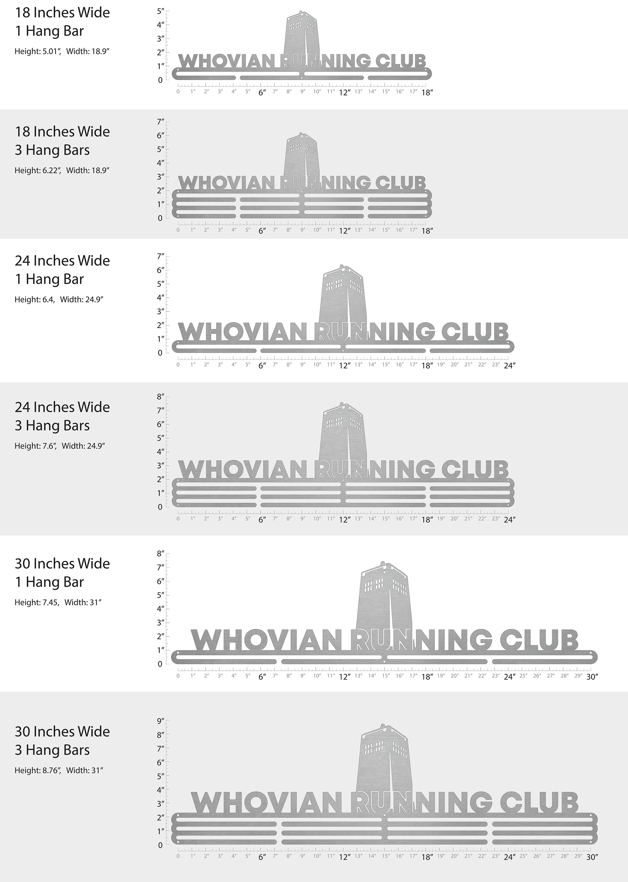 Unsure what size to get? We have created two consistently scaled images to show you what different sized displays look like when filled with medals.