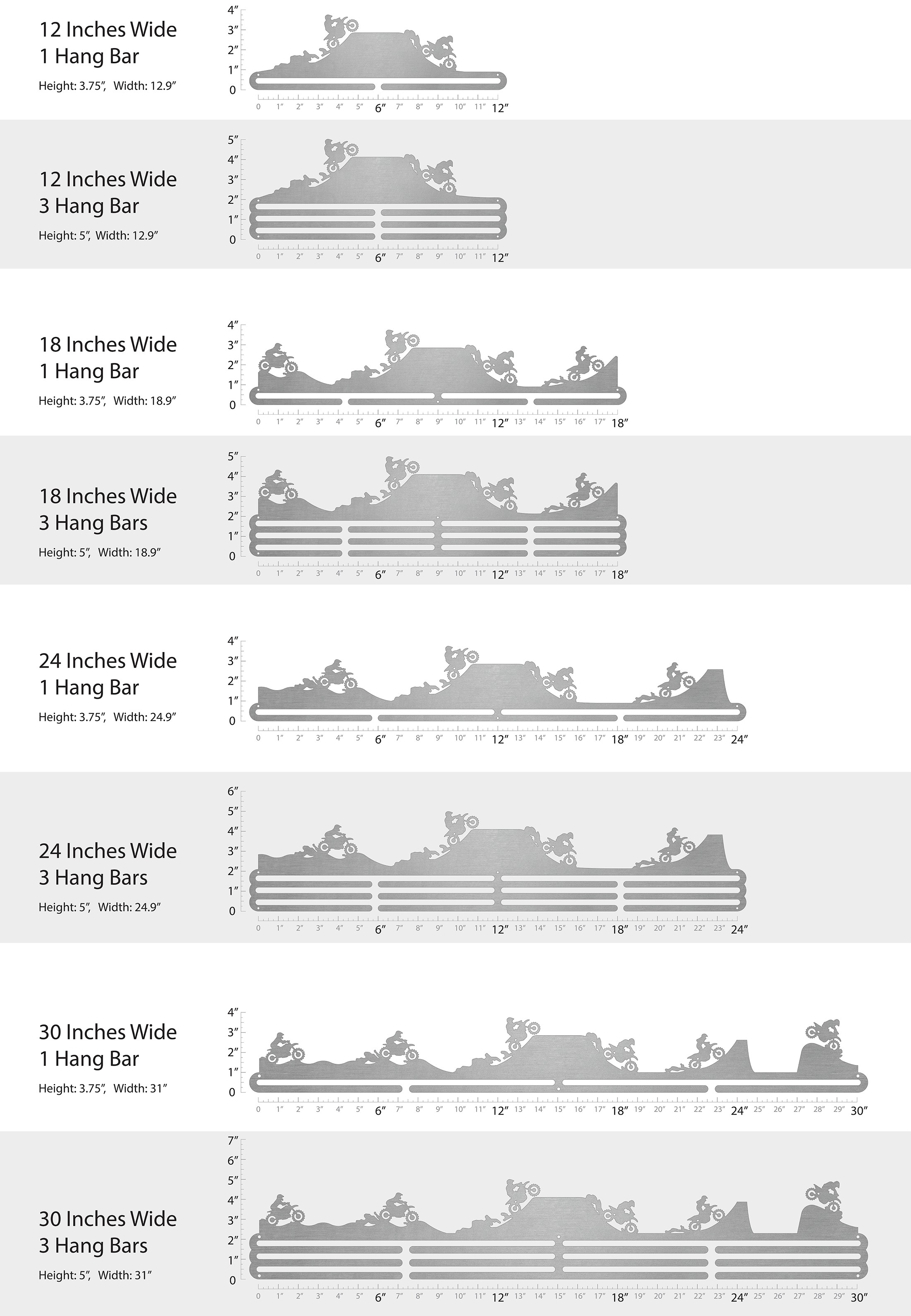 Unsure what size to get? We have created two consistently scaled images to show you what different sized displays look like when filled with medals.