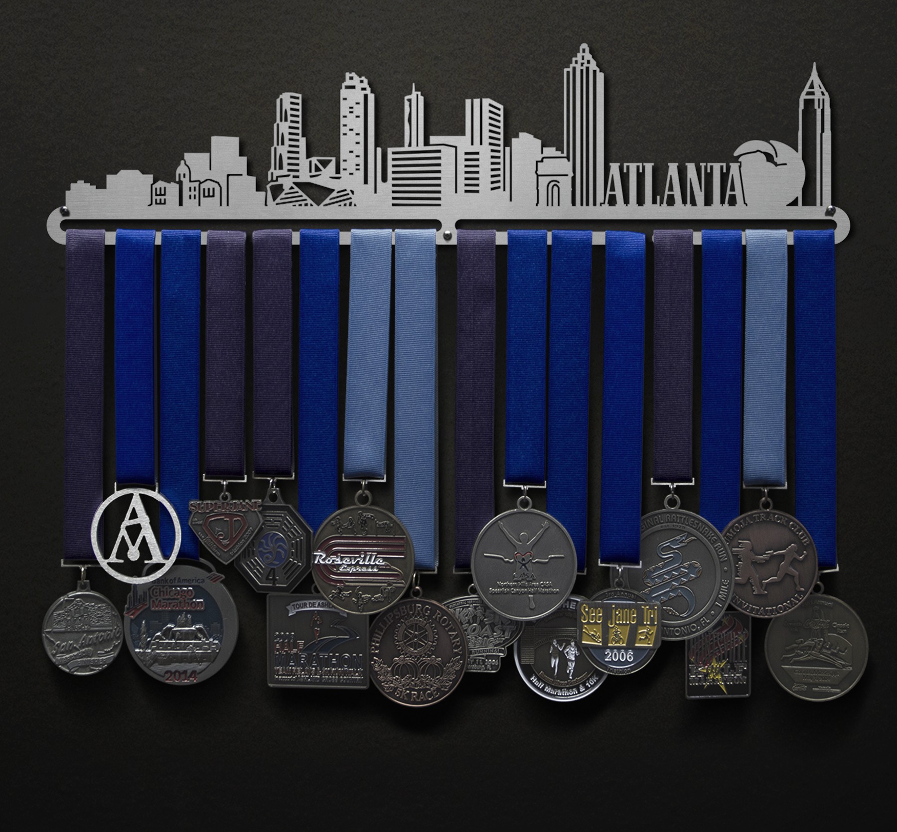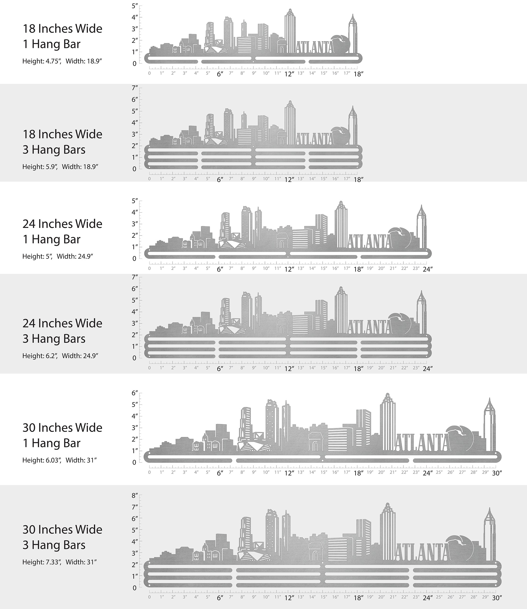 Unsure what size to get? We have created two consistently scaled images to show you what different sized displays look like when filled with medals.