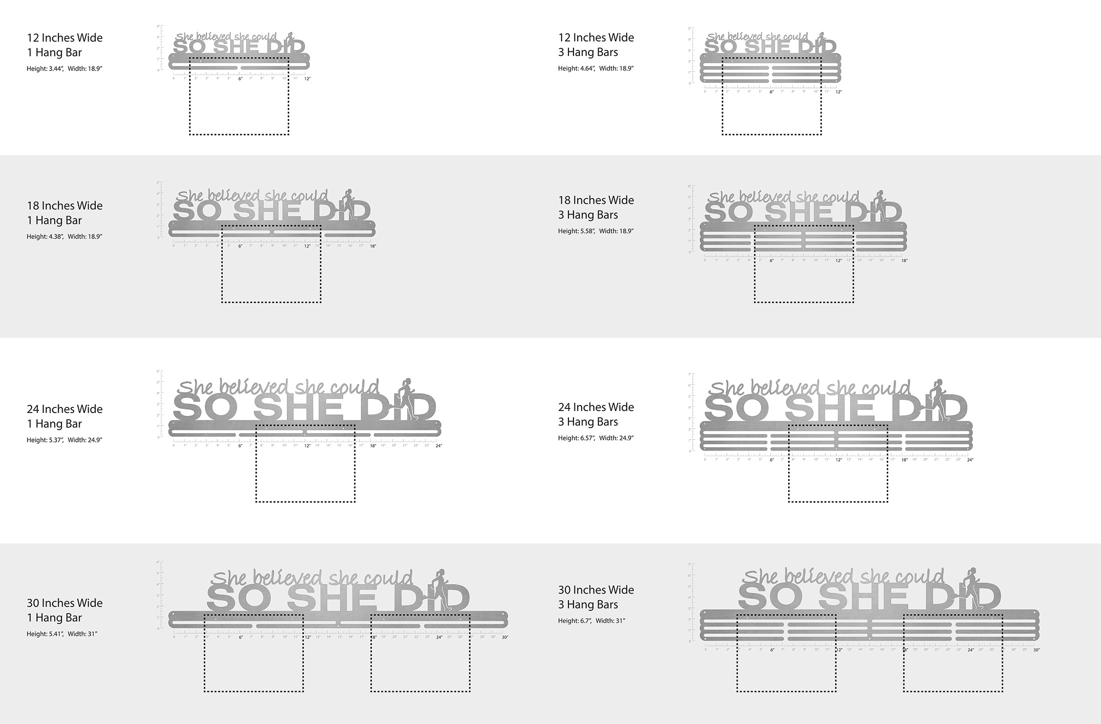 Unsure what size to get? We have created two consistently scaled images to show you what different sized displays look like when filled with medals.