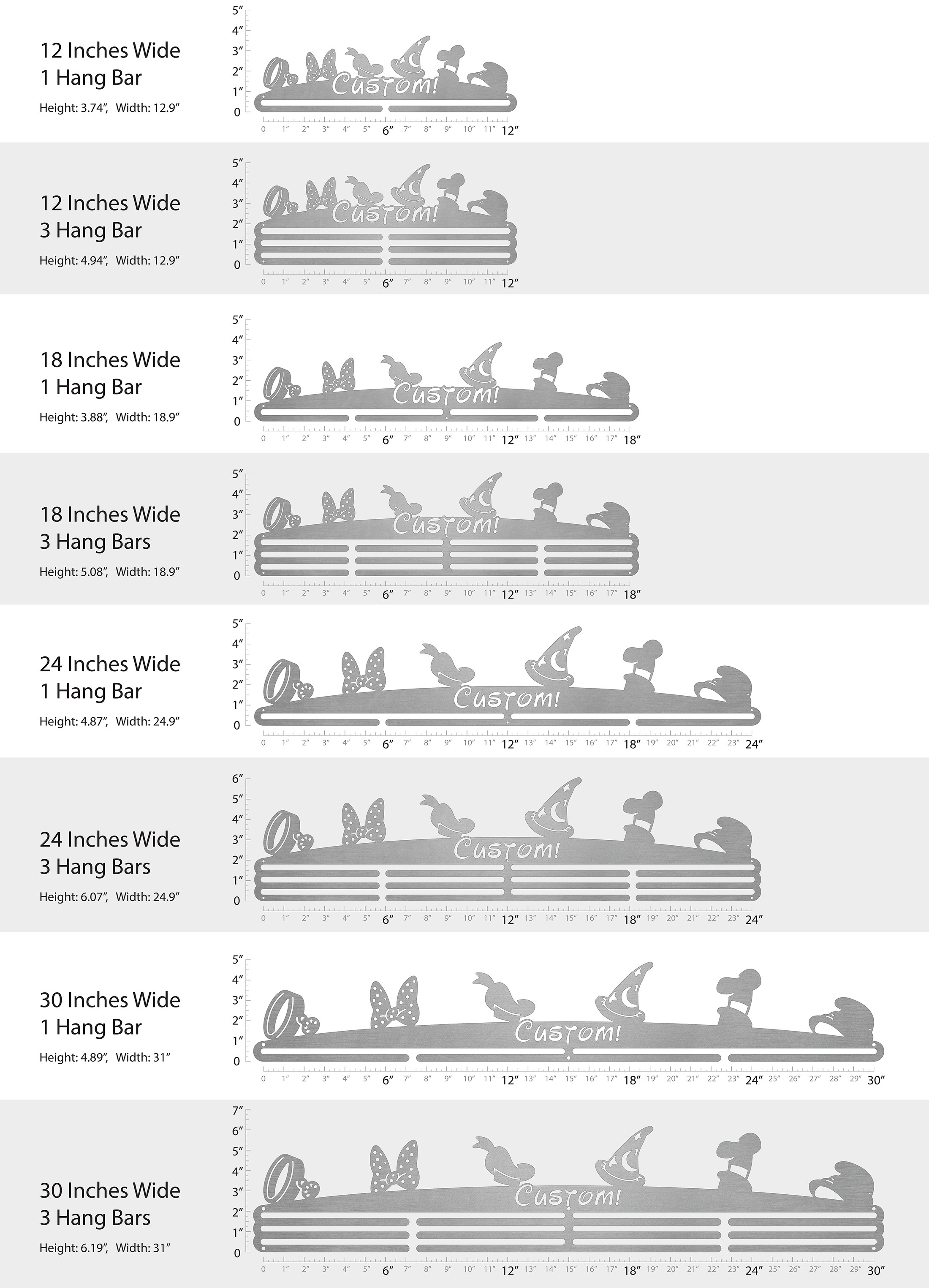 Unsure what size to get? We have created two consistently scaled images to show you what different sized displays look like when filled with medals.
