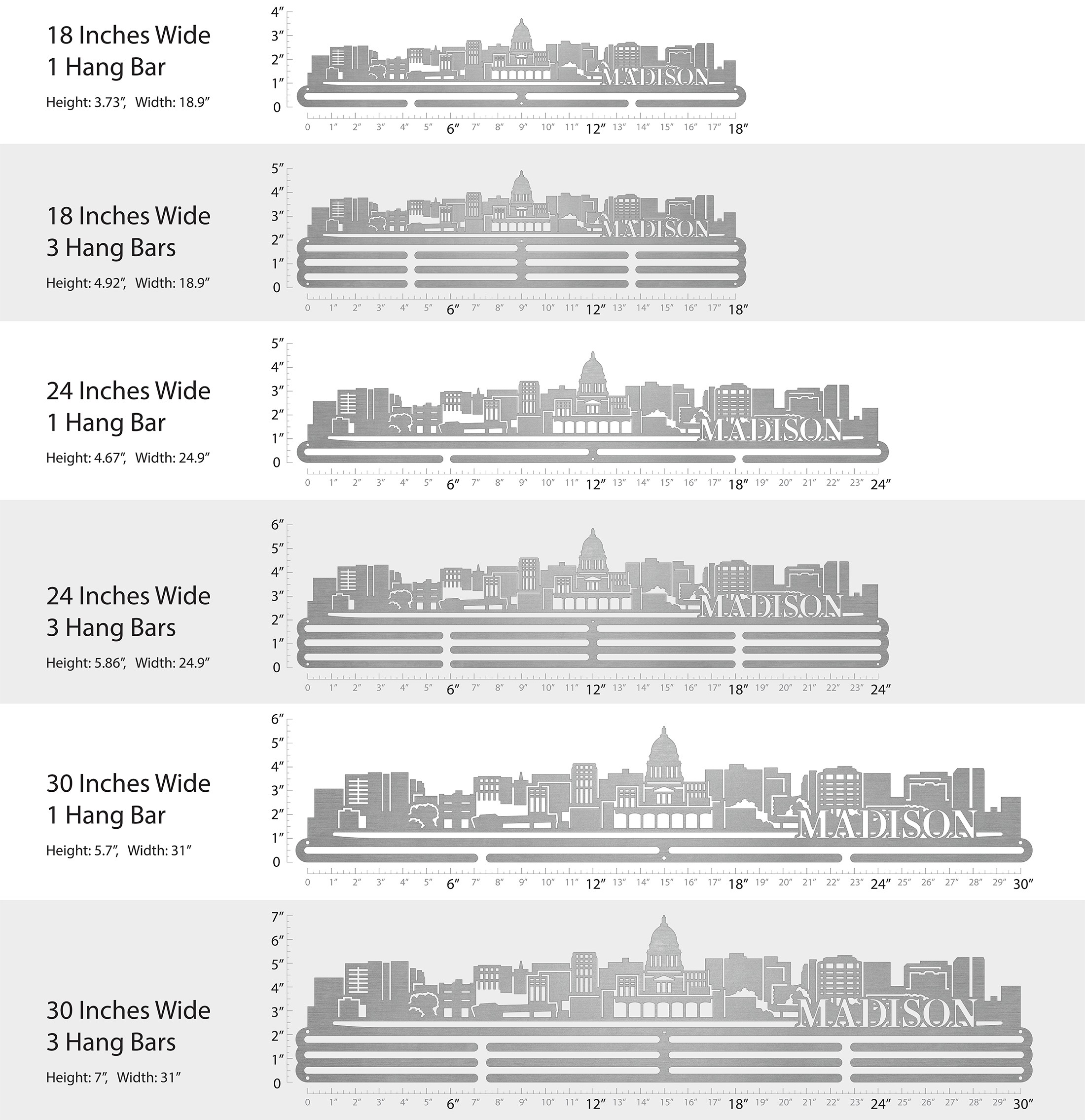 Unsure what size to get? We have created two consistently scaled images to show you what different sized displays look like when filled with medals.