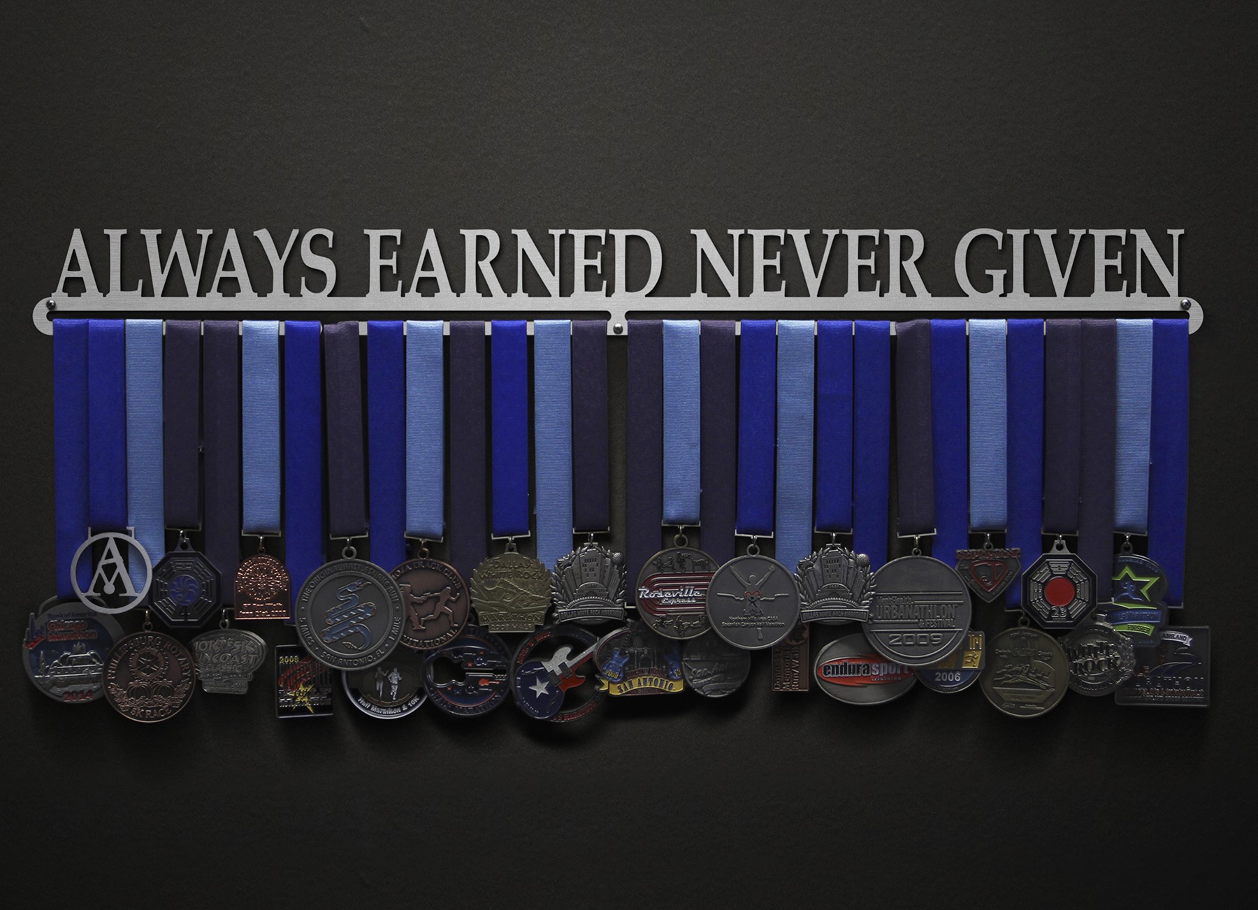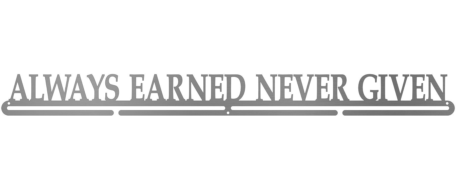 Anything you accomplish is accomplished by YOU. No one else can do it for you. Whether you're faced with a tough game, grueling race, or long distance marathon, you can never expect to be given anything. Think of your medals as badges of courage, strength and determination. Then display them loud and proud with this laser cut brushed stainless steel medal display. This hanger is only for medals you have earned - never for given ones.