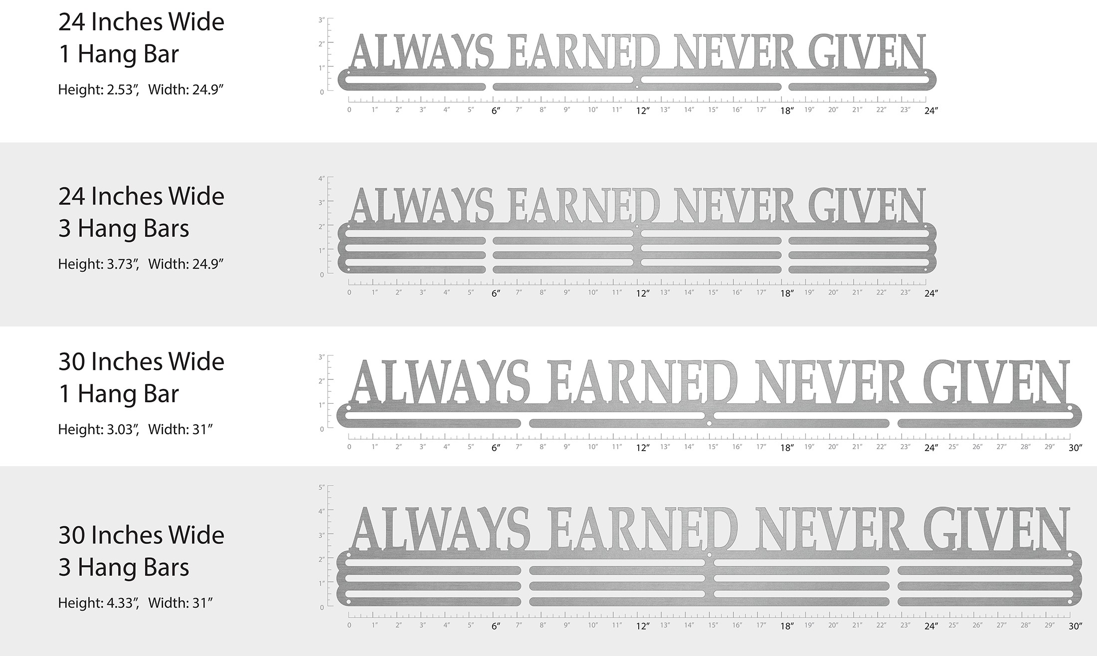 Unsure what size to get? We have created two consistently scaled images to show you what different sized displays look like when filled with medals.
