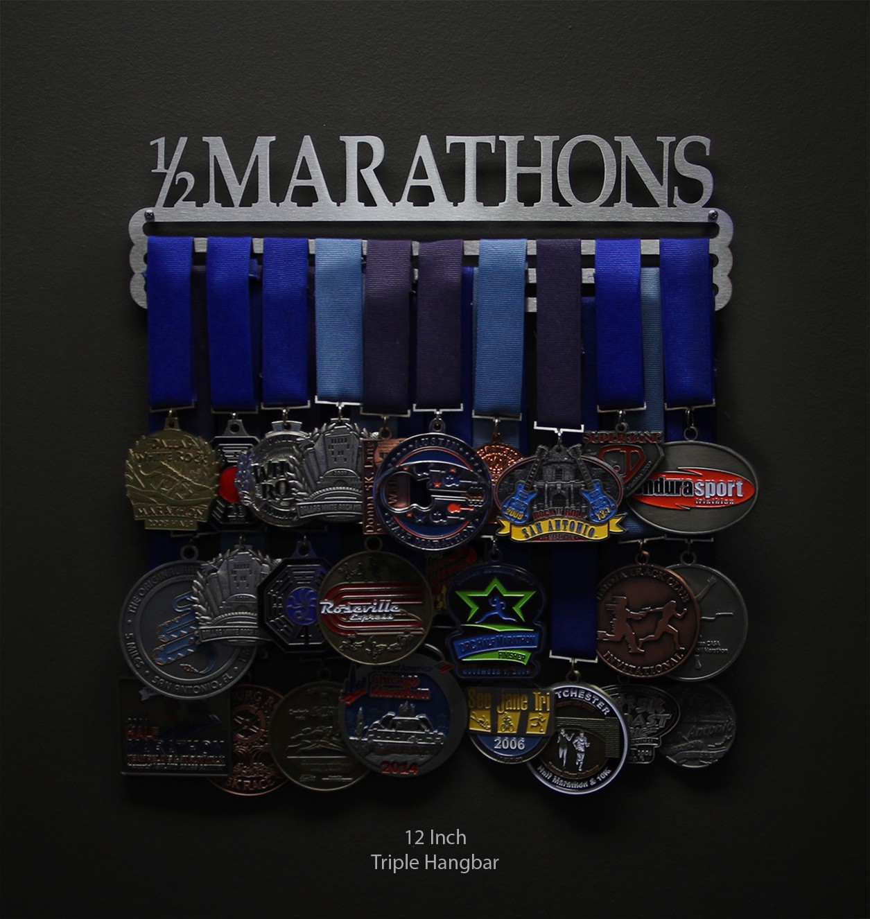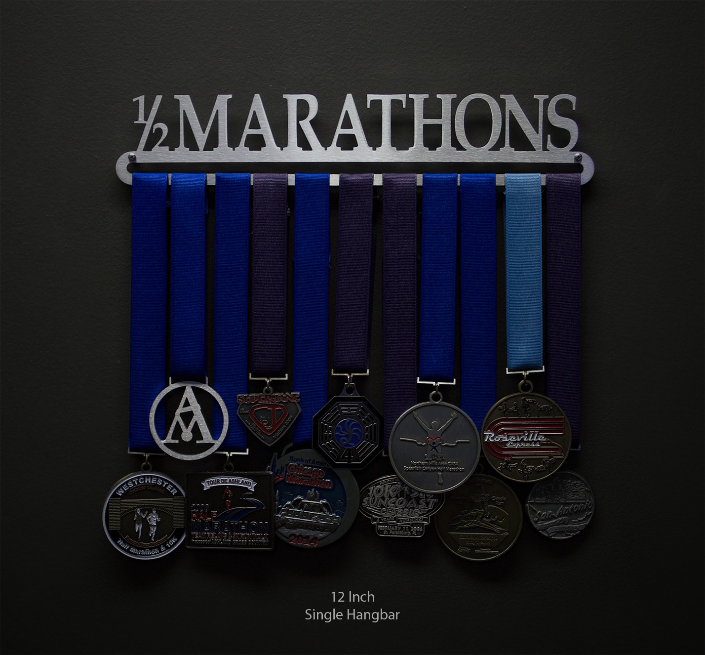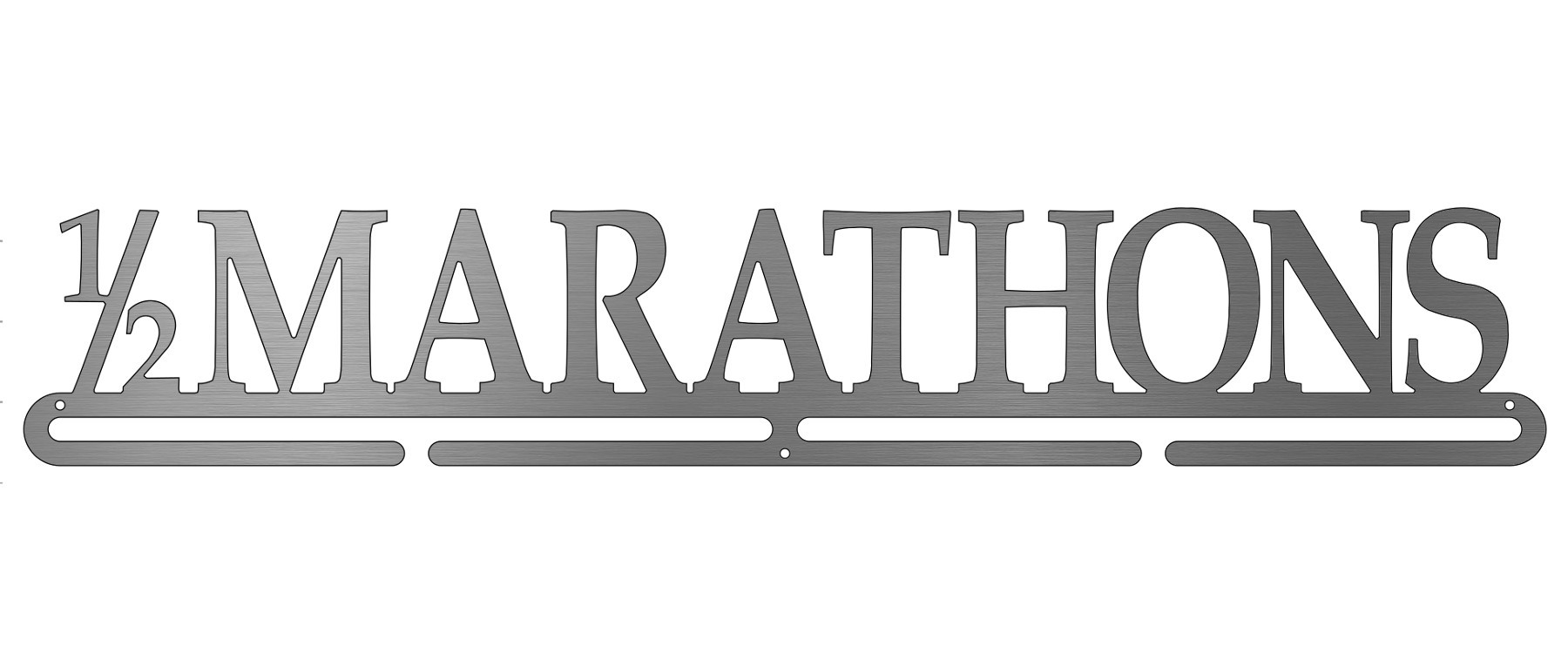 This display was designed to show off all your 1/2 marathon finisher medals! Running 13 miles is no easy task, and a triumph of that nature deserves to be celebrated. The medal hanger is laser cut from brushed stainless steel for a look as elegant as you are determined.