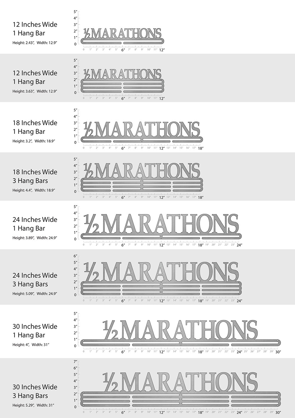 Unsure what size to get? We have created two consistently scaled images to show you what different sized displays look like when filled with medals.