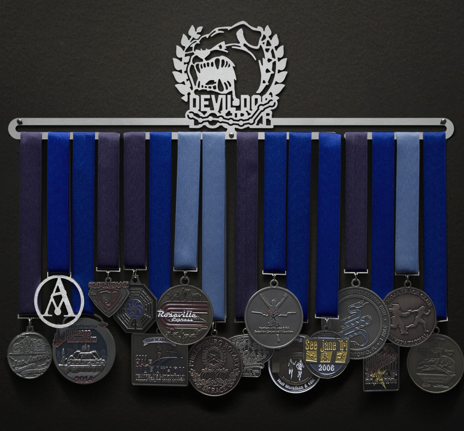Was a regular marathon not enough for you? Did you run up Hospital Hill TWICE in one day? Show off your achievement with a Devil Dog Double themed medal hanger.