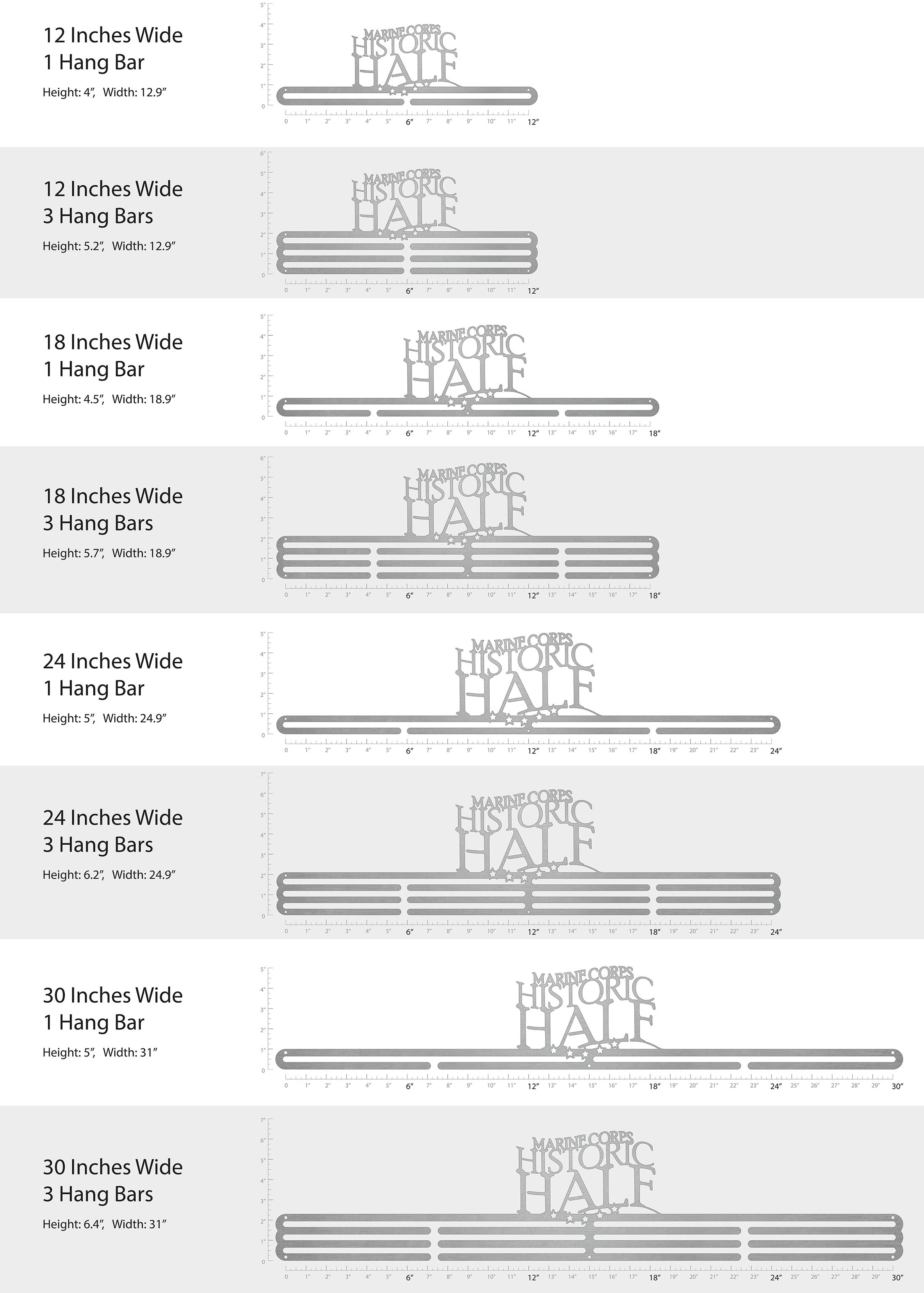 Unsure what size to get? We have created two consistently scaled images to show you what different sized displays look like when filled with medals.
