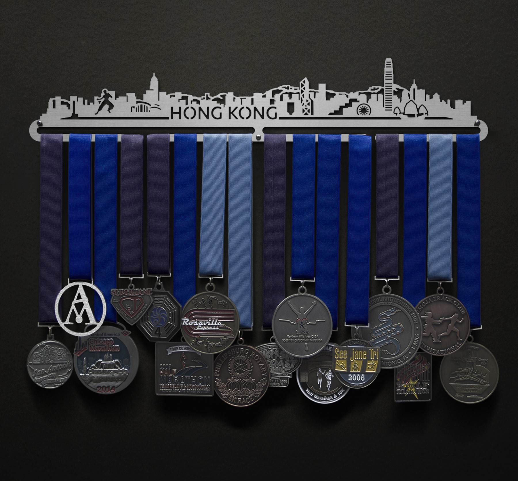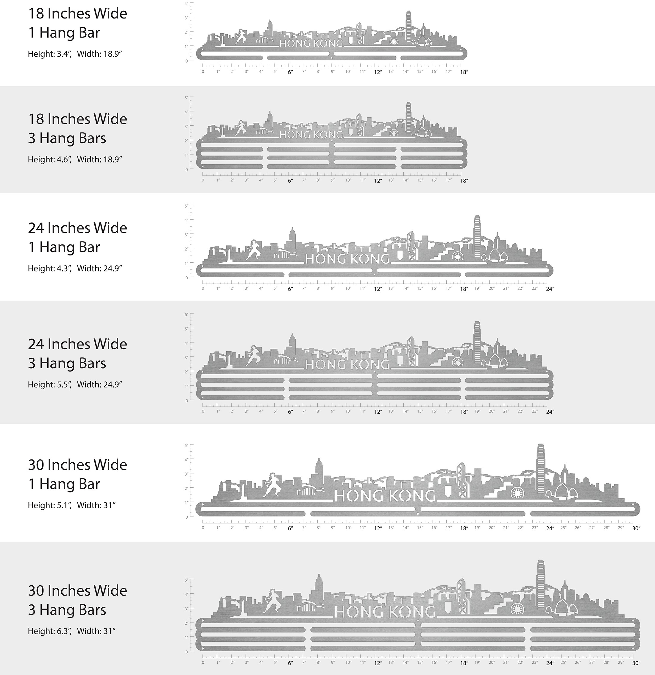 Unsure what size to get? We have created two consistently scaled images to show you what different sized displays look like when filled with medals.